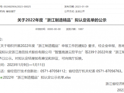 浙江省经济和信息化厅于2023年1月9日公示了2022年度“浙江制造精品”拟认定名单,YY易游m6米乐股份有限公司“第五代移动警务终端P99