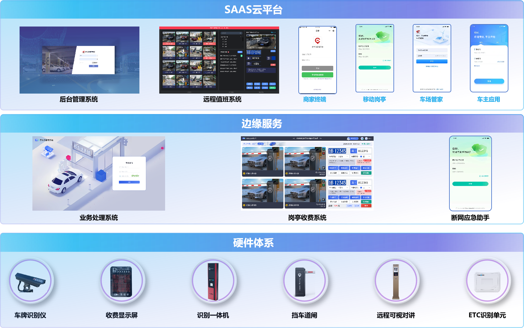 为停车场提供软硬件一体智能化解决方案,实现停车场资源、前端设备、通行规则、计费标准的统一配置管理。支持软件平台Saas服务功能,运营单位无需单独部署平台,依托信电停车场运营管理Saas平台,实现停车场的集约化管理。